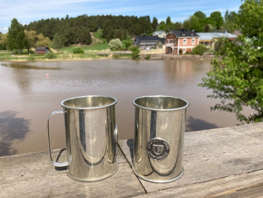 Kuvassa on Porvoon mitta matkamuiston muodossa. Peltimukin sisällä on yllätys, kyljessä Porvoon vaakuna. Taustalla Linnamäki, jossa on aikanaan ollut hirsirakenteinen linnoitus. Kenties siellä ovat sijainneet myös voudin kätköt. (Kuva Tuula Lukić 25.5.2021)